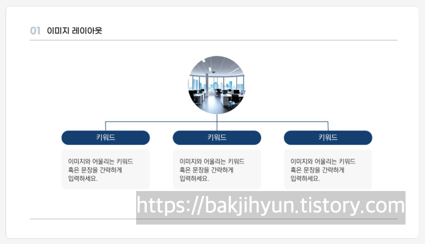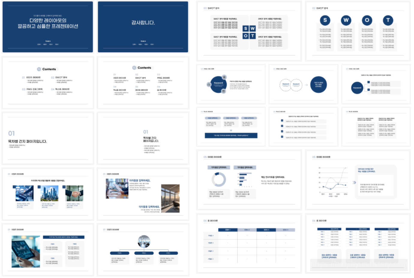 네이비 컬러가 포인트로 사용된 안정적인 느낌을 주는 프레젠테이션 디자인