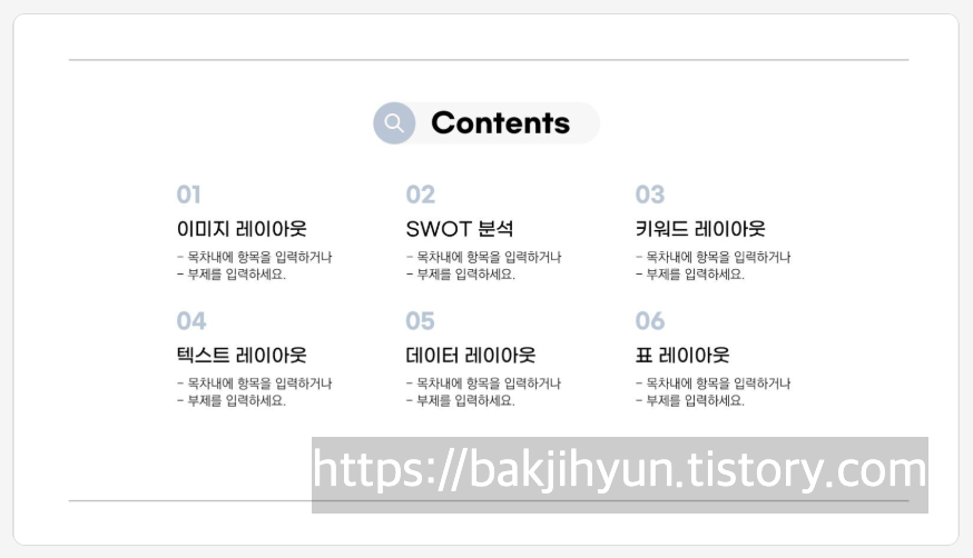 4~6개의 항목으로 나누면 발표 구조가 한눈에 들어옵니다.