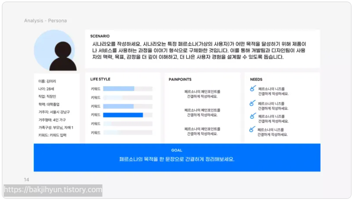 기본정보, 성향, 목표, Pain Points, Needs 등을