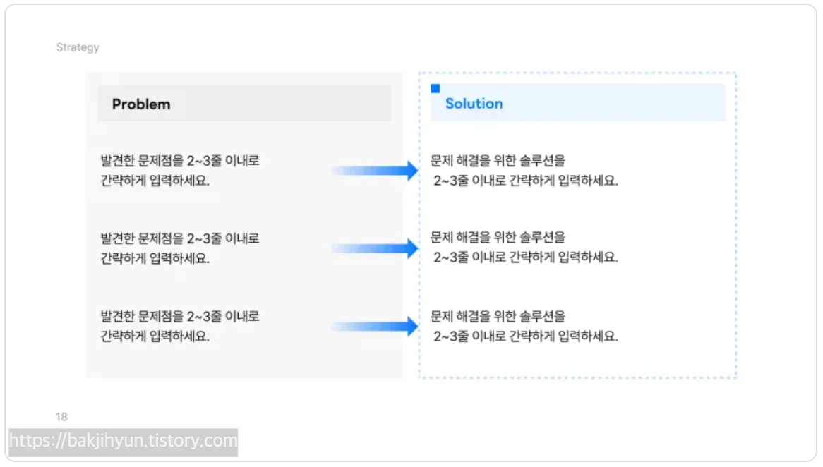 문제점 → 솔루션 → 전략의 흐름을 깔끔하게 정리할 수 있는 파트입니다.
